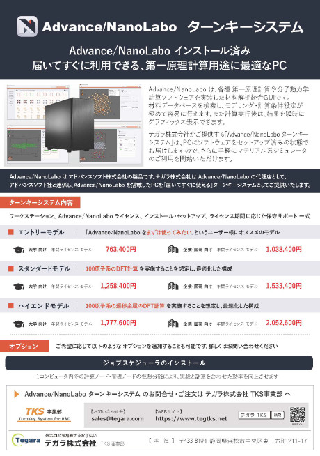 Advance/NanoLaboは最小限の手順のみで直感的に操作できるようにデザインされているのが特長で、これから材料シミュレーションを始める方に最適です (詳細はこちら)。弊社でご提供する Advance/NanoLabo ターンキーシステムは、PCにソフトウェアをセットアップ済みの状態でお届けしますので、さらに手軽にマテリアル系シミュレータのご利用を開始いただくことが可能になります。